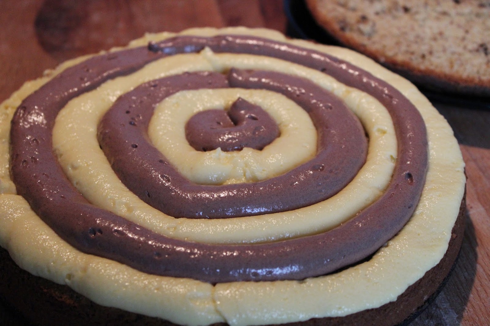 Die Cremen in Spritzbeutel füllen und abwechselnd, in Kreisen auf den Tortenboden gespritzt. Nochmals kalt stellen.