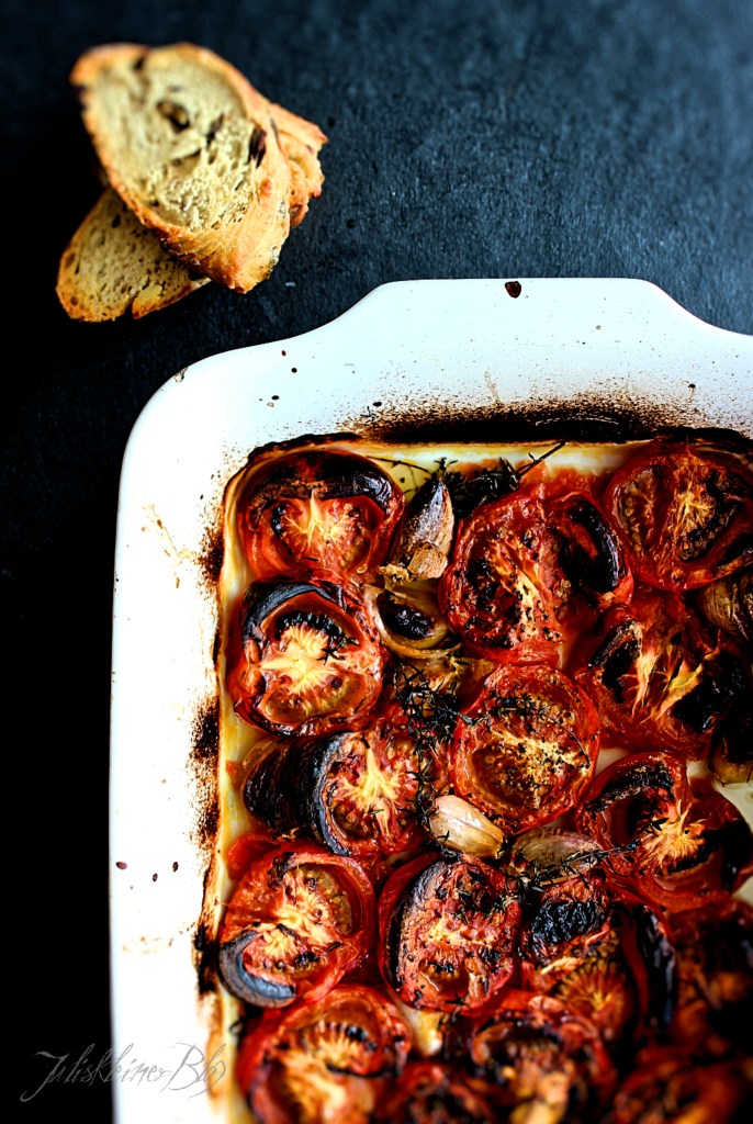 Im Backrohr bei ca. 200°C, Ober- und Unterhitze ca. 45 Minuten backen, bis die Tomaten weich geworden sind. Mit Weißbrot serviert, ist das eine gute Vorspeise und eignet sich auch gut für einen Tapas-Abend.