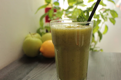 Die Zitrone auspressen und die Äpfel waschen, entkernen und in kleine Stücke schneiden. Das Basilikum waschen und grob hacken. Alle Zutaten in einem Standmixer 1-2 Minuten mixen, bis alles sämig ist.