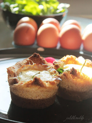 Im Ofen für ca. 15 Minuten backen. Dann sollte das Eigelb noch flüssig sein. Wenn man das nicht möchte lässt man die Muffins 5-8 Minuten länger im Ofen.