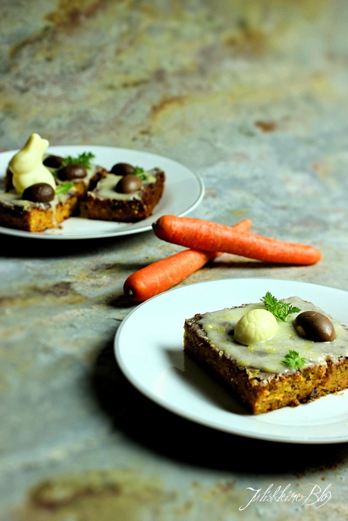 Butter, braunen Zucker, Zimt und Eier schaumig schlagen und die Karotten und die Milch untermischen.