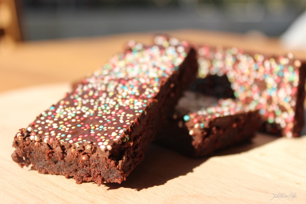 Die Schokoglasur nach Packungsanleitung zubereiten. Man kann natürlich auch selbst eine machen. Die Glasur über den Brownies verteilen und mit Zuckerperlen verzieren. Warten bis die Glasur ausgehärtet ist, dann die Brownies in Stückchen schneiden.