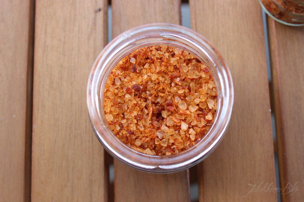 Um überschüssige Feuchtigkeit loszuwerden das Salz einen Tag lang, an einem trockenen warmen Ort, trocknen lassen. Das Salz hält sich ca. 4 Wochen.