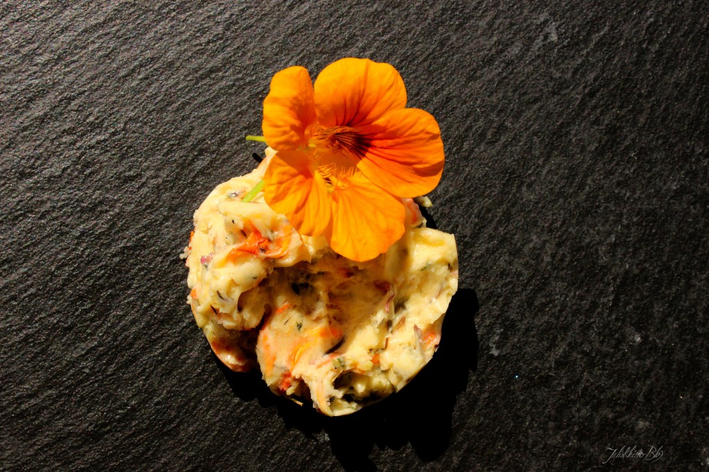Für Blütenbutter benötigt man, wer hätte es gedacht, essbare Blüten. Am besten eignen sich solche von Kräutern, wie Thymian oder Rosmarin. Aber auch Kapuzinerkresse oder Ringelblumen haben wohlschmeckende Blüten. Welche man verwendet bleibt jedem selbst überlassen. Mit einem eigenen Kräuterbeet ist es natürlich einfacher solche Blüten zu beschaffen. In manchen gut sortierten Supermärkten gibt es aber auch hin und wieder Essbare Blüten zu kaufen.