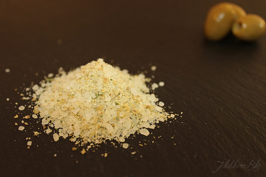 Die Kerne der Oliven entfernen. Alle Zutaten in einer Küchenmaschine fein zerkleinern. Das Salz auf ein Backblech streichen, welches mit Backpapier ausgelegt ist. Im Ofen bei 50°C, Ober- und Unterhitze, ca. eine Stunde lang trocknen.