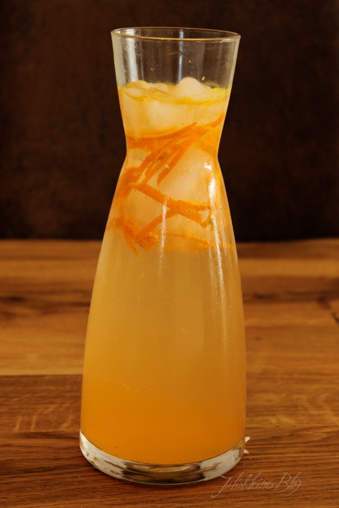 Die Orange schälen und die Schale in feine Streifen schneiden. Die Eiswürfel in eine Karaffe geben. Den Saft der Orange auspressen und mit dem Lavendelsirup und den Orangenschalen zu den Eiswürfeln geben. Mit Sodawasser aufgießen und servieren.
