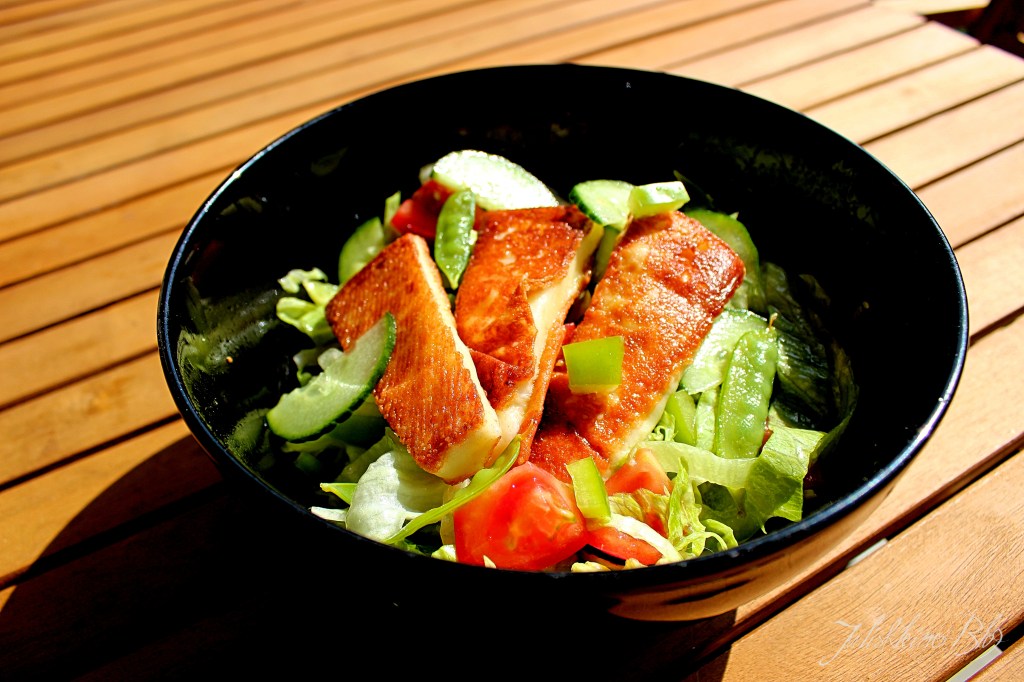 Die Zuckerschoten in Salzwasser ca. 3 Minuten bissfest kochen und in kaltem Wasser abschrecken. Das restliche Gemüse waschen und in kleine Stücke schneiden. Für das Dressing, Salz, Zitronensaft und Olivenöl vermischen. Den Käse in ca. 0,8mm dicke Scheiben schneiden. Diese in Mehl wenden. In einer Pfanne etwas Öl erhitzen und den Käse darin auf jeder Seite ca. 1-2 Minuten goldbraun anbraten.