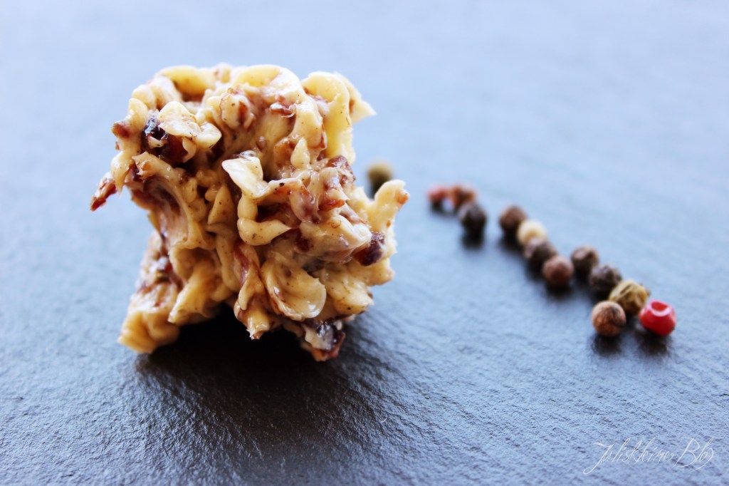 Die Zwiebel schälen und fein schneiden. Den Speck ebenfalls in sehr kleine Stücke schneiden. Mit ca. 5g Butter in einer Pfanne anbraten bis sie Zwiebel schön angebräunt sind und der Speck schön knusprig ist. Den Pfeffer und den Kümmel in einem Mörser fein zerkleinern. Ich bevorzuge frisch gemahlene Gewürze, da diese mehr Geschmack hat als die fertig gemahlenen. Alle Zutaten gründlich miteinander vermischen und die fertige Butter im Kühlschrank aufbewahren. Man kann sie auch in Portionen einfrieren.