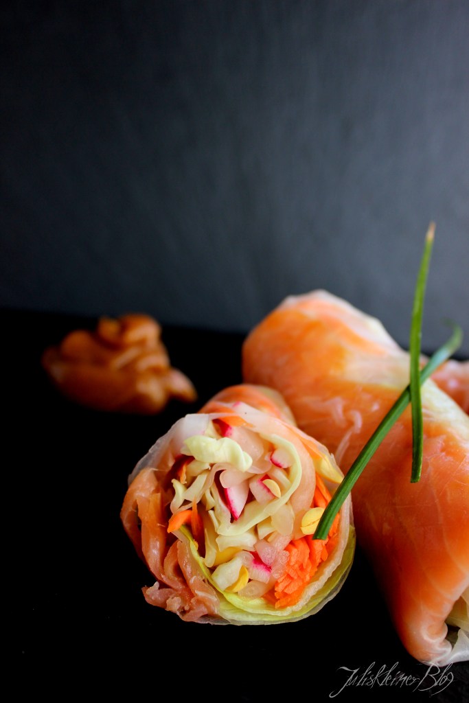 Am besten ist es, wenn man sich alle Zutaten vor dem Rollen herrichtet. Zuerst je ein Blatt Reispapier für ca. 10 Sekunden unter kaltes Wasser halten. Das Reispapier auf die Arbeitsfläche legen, und ein Blatt Salat in die untere Mitte legen. Etwas von den Sprossen, Karotten, Kraut und Radieschen auf das Salatblatt legen. Zum Schluss eine Scheibe Lachs darauflegen. Nun muss man das Reispapier rollen. Den unteren Teil über das Gemüse klappen, dann die beiden Seiten in die Mitte klappen und das Papier bis zum Ende aufrollen. Mit dem restlichen Reispapier wiederholen.