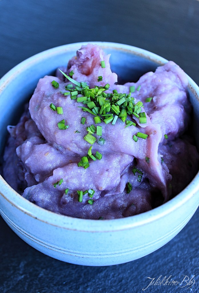 Salz und Butter dazugeben und mit einem Kartoffelstampfer zerkleinern. Den Schnittknoblauch fein schneiden und zum Püree geben.