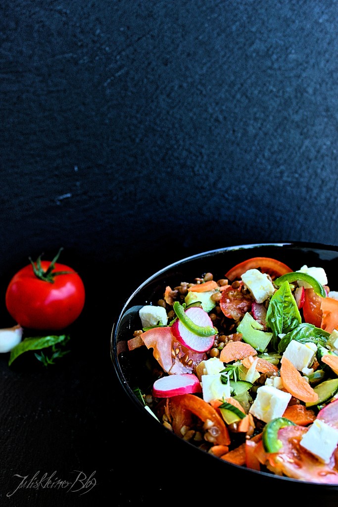 Das Gemüse waschen und die Karotten schälen. Jalapeños entkernen und gemeinsam mit dem restlichen Gemüse in mundgerechte Stücke schneiden. Den Feta in kleine Würfel schneiden und mit den Linsen und dem Gemüse vermischen.