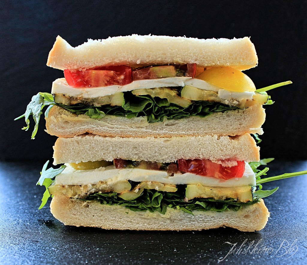 Je eine Scheibe Toast mit Butter bestreichen. Diese mit Rucola belegen und darauf die Zucchini Scheiben legen. Feta darauf schlichen und zum Schuss die Tomaten. Oben drauf die zweite Scheibe Toast. In der Mitte durchschneiden und servieren.