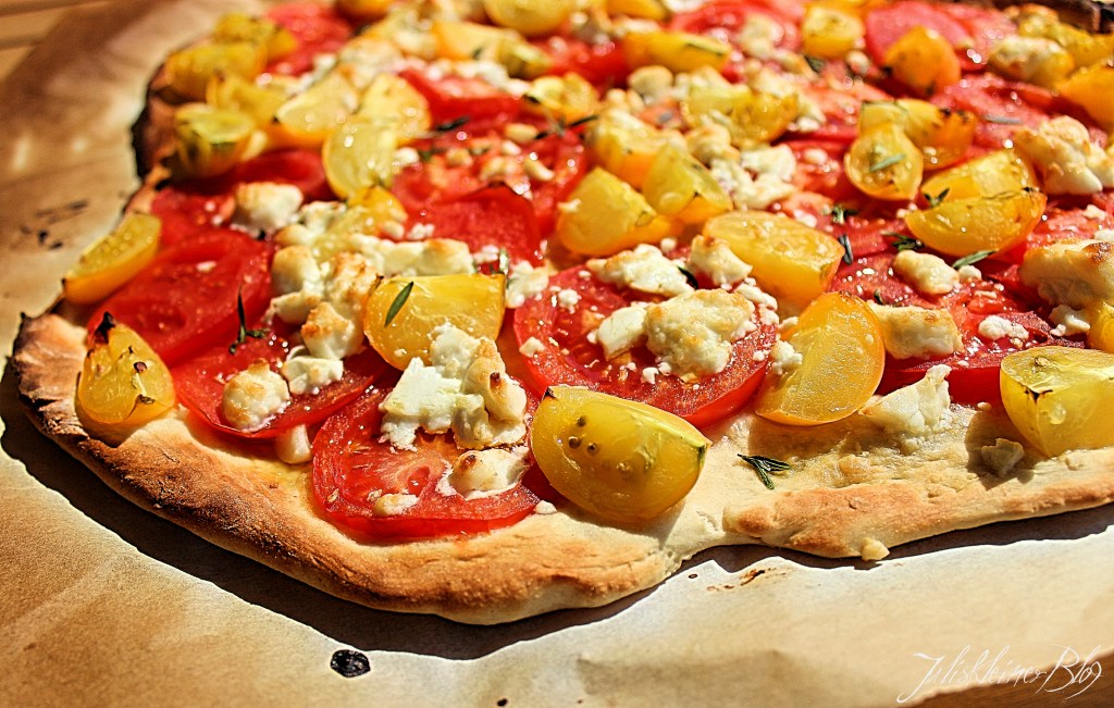 Die Tomaten auf dem Teig verteilen. Den Feta zerbröseln und drüber streuen. Vom Thymian die Blätter abzupfen und über die Pizza streuen. Zum Schluss mit etwas Olivenöl beträufeln. Die Pizza 10-15 Minuten, goldbraun backen.