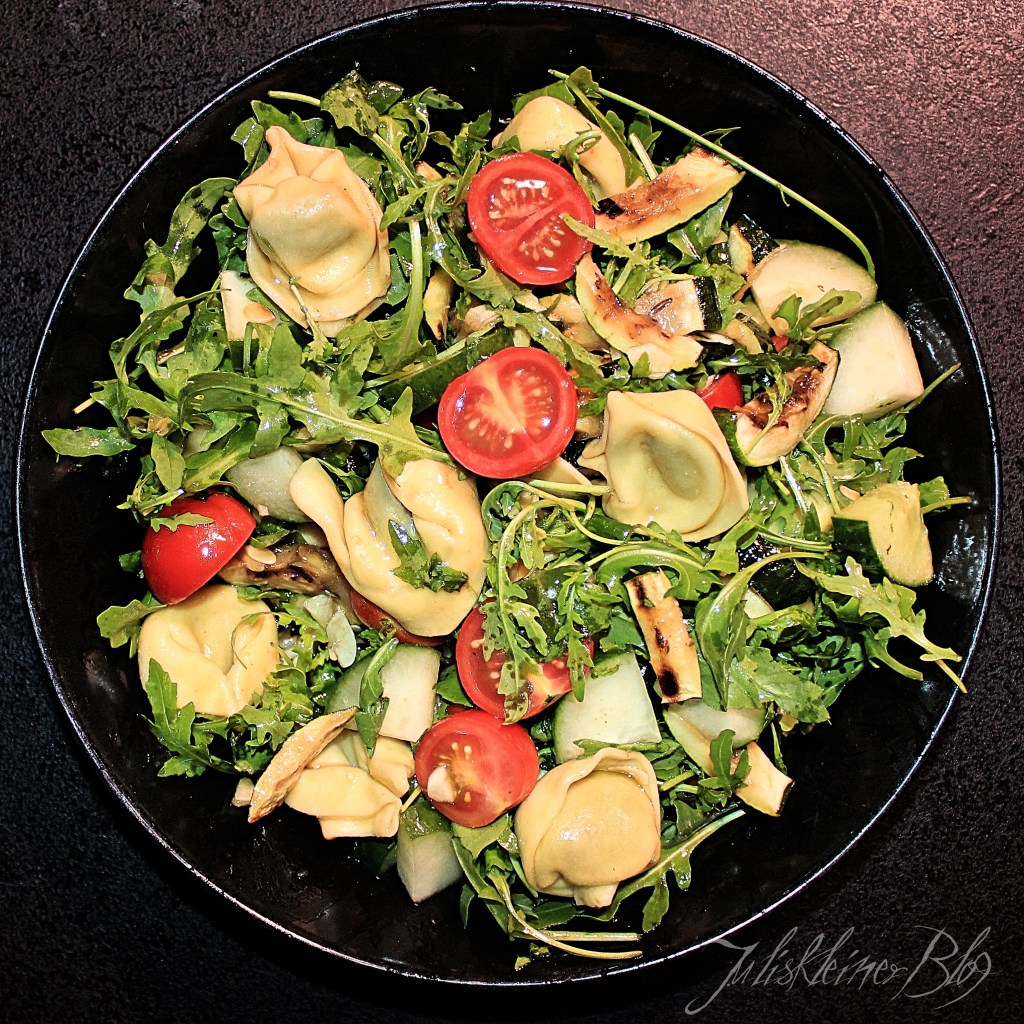 Welche Füllung die Tortellini haben entscheidet der persönliche Geschmack. Die Zucchini in Scheiben schneiden und in einer Grillpfanne anbraten. Gurke, Rucola und Tomaten waschen und den Knoblauch schälen. Tomaten, Zucchini, Gurken und Knoblauch schneiden.
