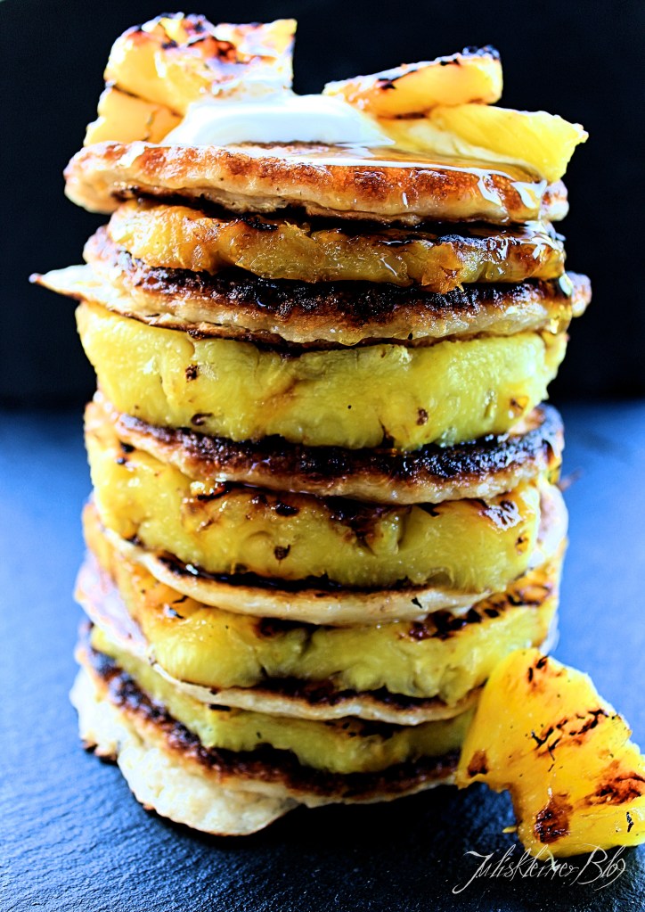 6 Pancakes ausbacken, sie sollten in etwa die Größe der Ananasscheiben haben. Sobald Pancakes und die Ananasscheiben fertig sind, jeweils drei Pancakes und drei Ananasscheiben übereinander stapeln.