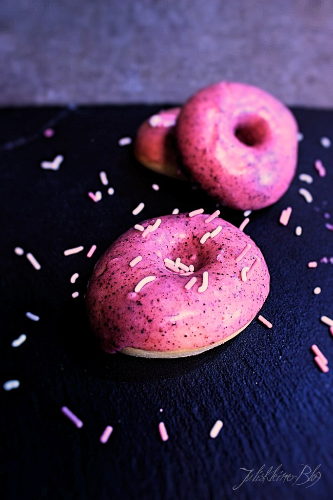 Die Glasur zubereiten, dafür die Butter schmelzen und mit Fruchtpulver vermischen. Staubzucker dazugeben und dann Löffelweise Wasser unterrühren, bis eine dickflüssige Glasur entsteht. Sollte es zu flüssig sein einfach noch Staubzucker dazugeben, wenn sie Glasur zu fest ist noch etwas Wasser. Wenn die Donuts etwas abgekühlt, aber noch ganz leicht warm sind, diese in die Glasur tauchen.