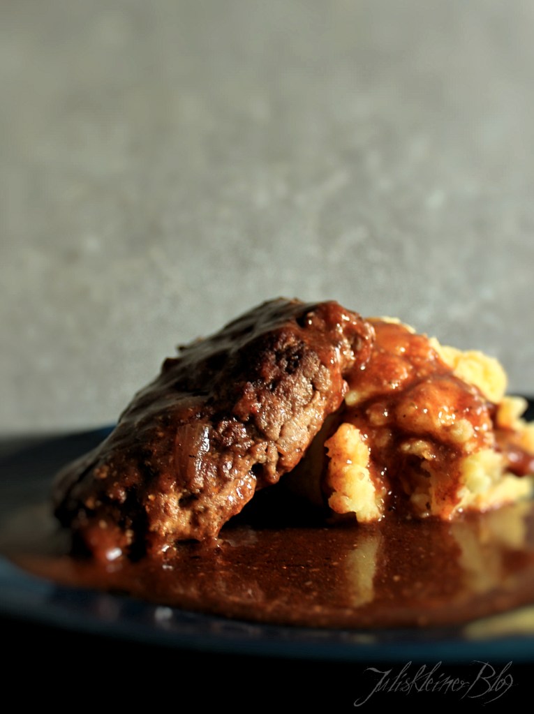 Wenn die Semmelwürfel weich sind, Fleisch und Salz dazu mischen und zu zwei Laibchen formen. In einer Pfanne das Öl erhitzen und die Laibchen darin von jeder Seite goldbraun anbraten. Die 19g Butter hinzufügen und für ca. 5 Minuten das Fleisch darin braten.