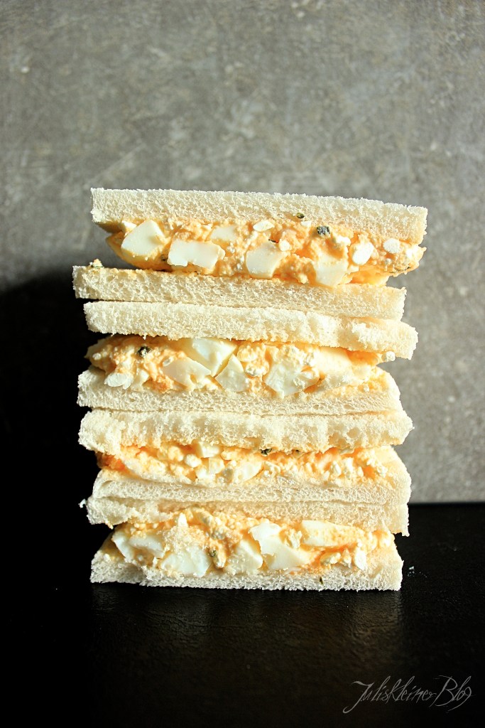 Den Eiersalat auf jeweils zwei Scheiben Brot verteilen und die anderen beiden Scheiben darauflegen.