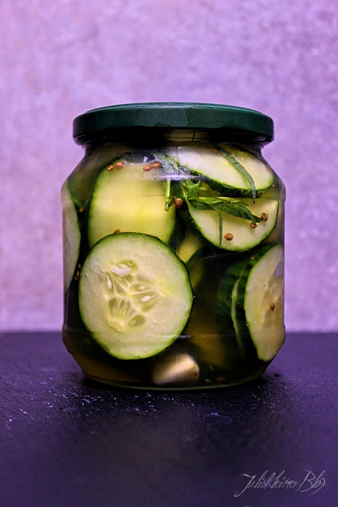 Die Gurke waschen und Scheiben schneiden. In ein Einmachglas schlichten. In einem Topf alle restlichen Zutaten aufkochen und über die Gurken gießen bis diese komplett bedeckt sind.