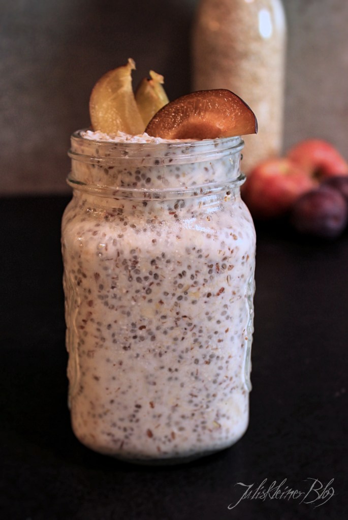 Den Apfel fein reiben, die Zwetschken in keine Stücke schneiden. Alle Zutaten miteinander vermischen und über Nacht im Kühlschrank ziehen lassen.