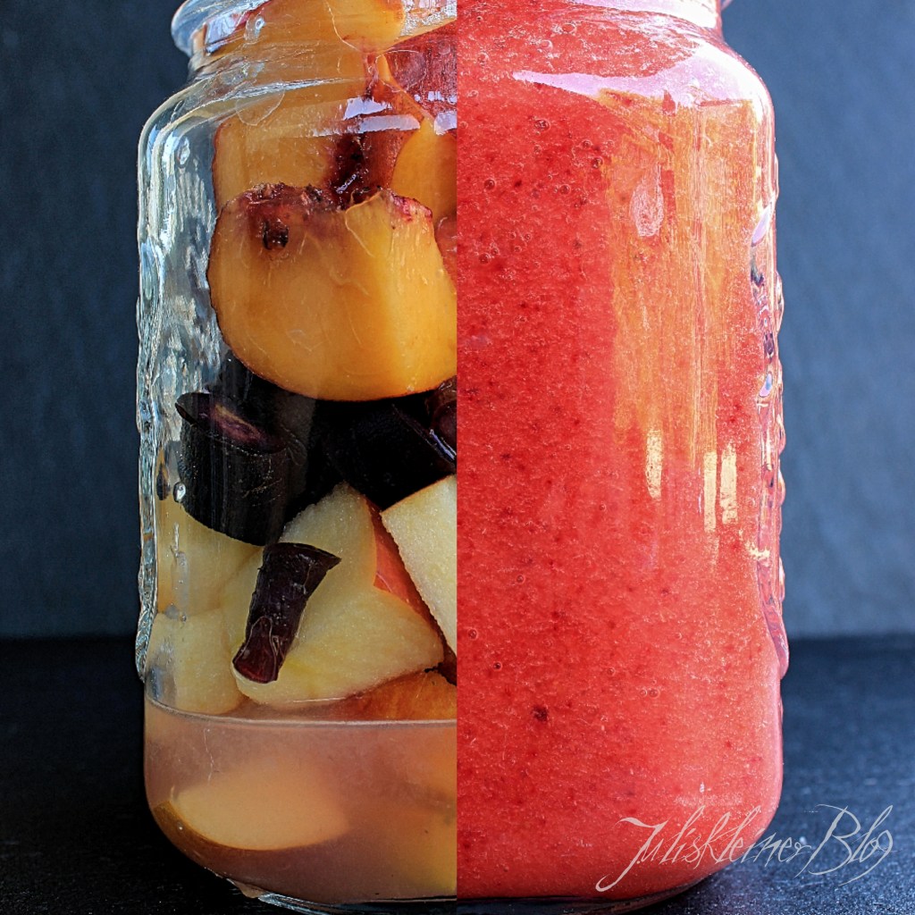 Zitrone auspressen, Apfel und Pfirsich waschen und entkernen, Karotten waschen und die Enden abschneiden. Obst und Gemüse in grobe Stücke schneiden und mit Wasser und Zitronensaft im Mixer zerkleinern.