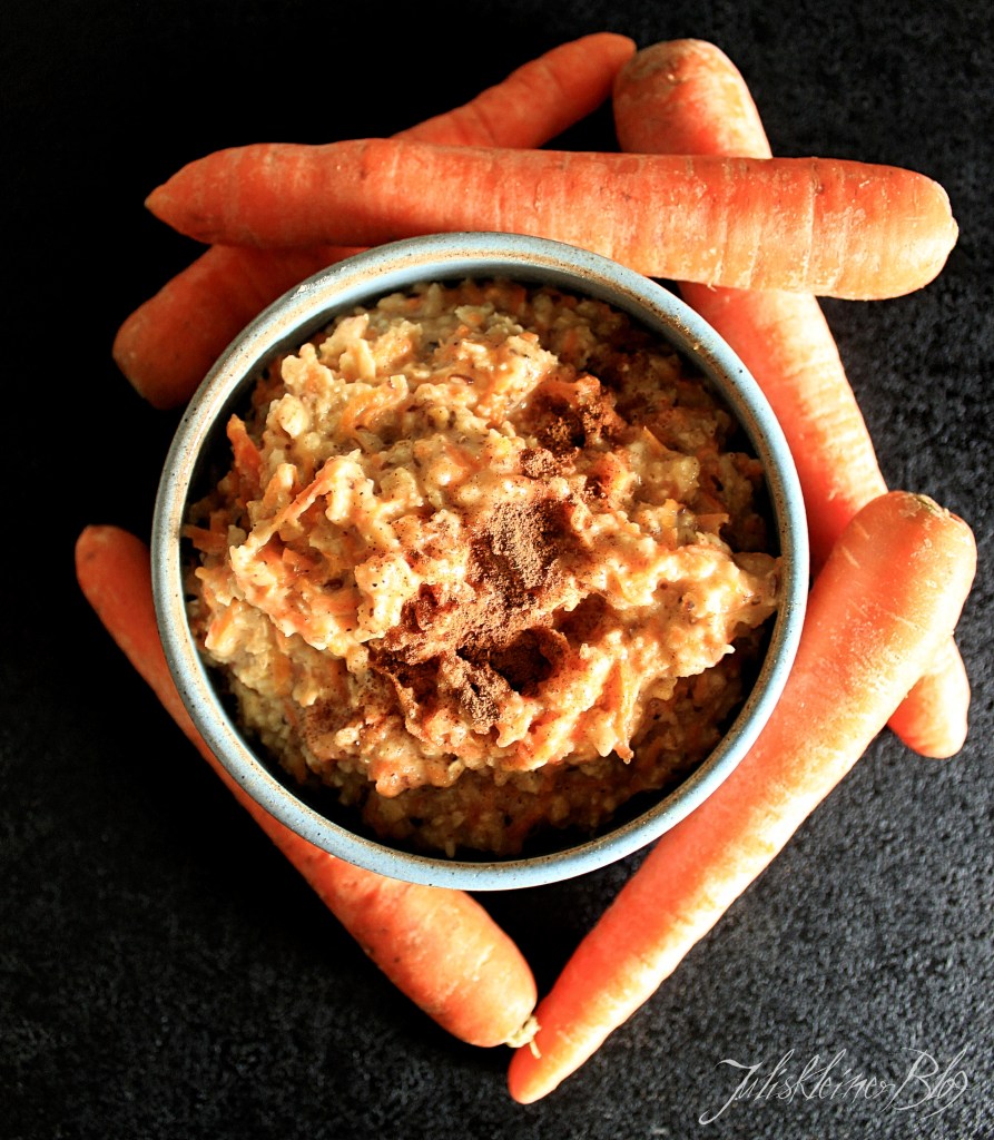 Milch mit Topfen glattrühren. Haferflocken und Leinsamen zu den Karotten geben und mit der Milch-Topfen Mischung aufgießen.