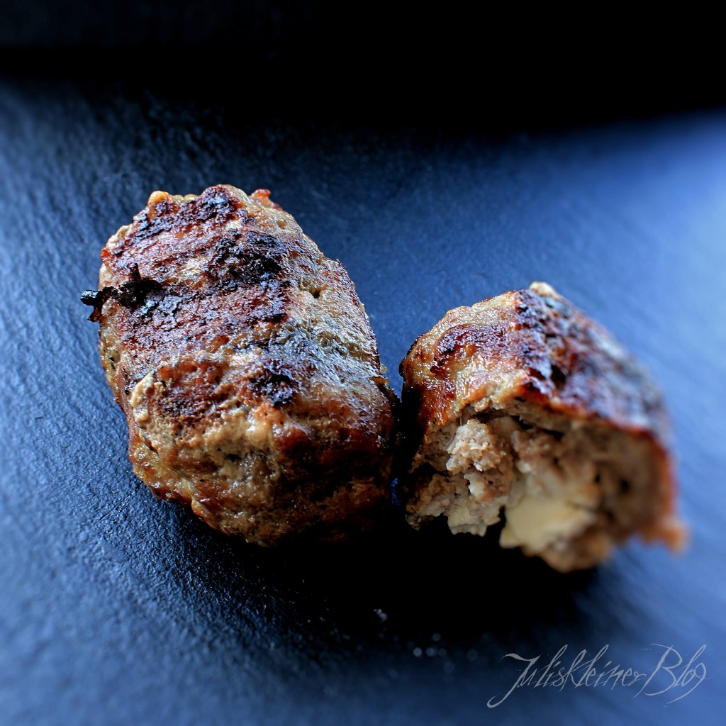 Zwiebel schälen, klein schneiden und in etwas Öl goldbraun anbraten. Die Zwiebel mit den anderen Zutaten (bis auf den Feta) vermischen und gut durchkneten. Zu 10 gleichgroßen Bällchen formen. Den Feta in 1cm dicke und 4cm lange Streifen schneide. Die Fleischbällchen flach drücken und je einen Feta Streifen hineinlegen. Die Fleischmasse um den Feta drücken, bis alles gut verschlossen ist. Es sollten ovale Bällchen werden.