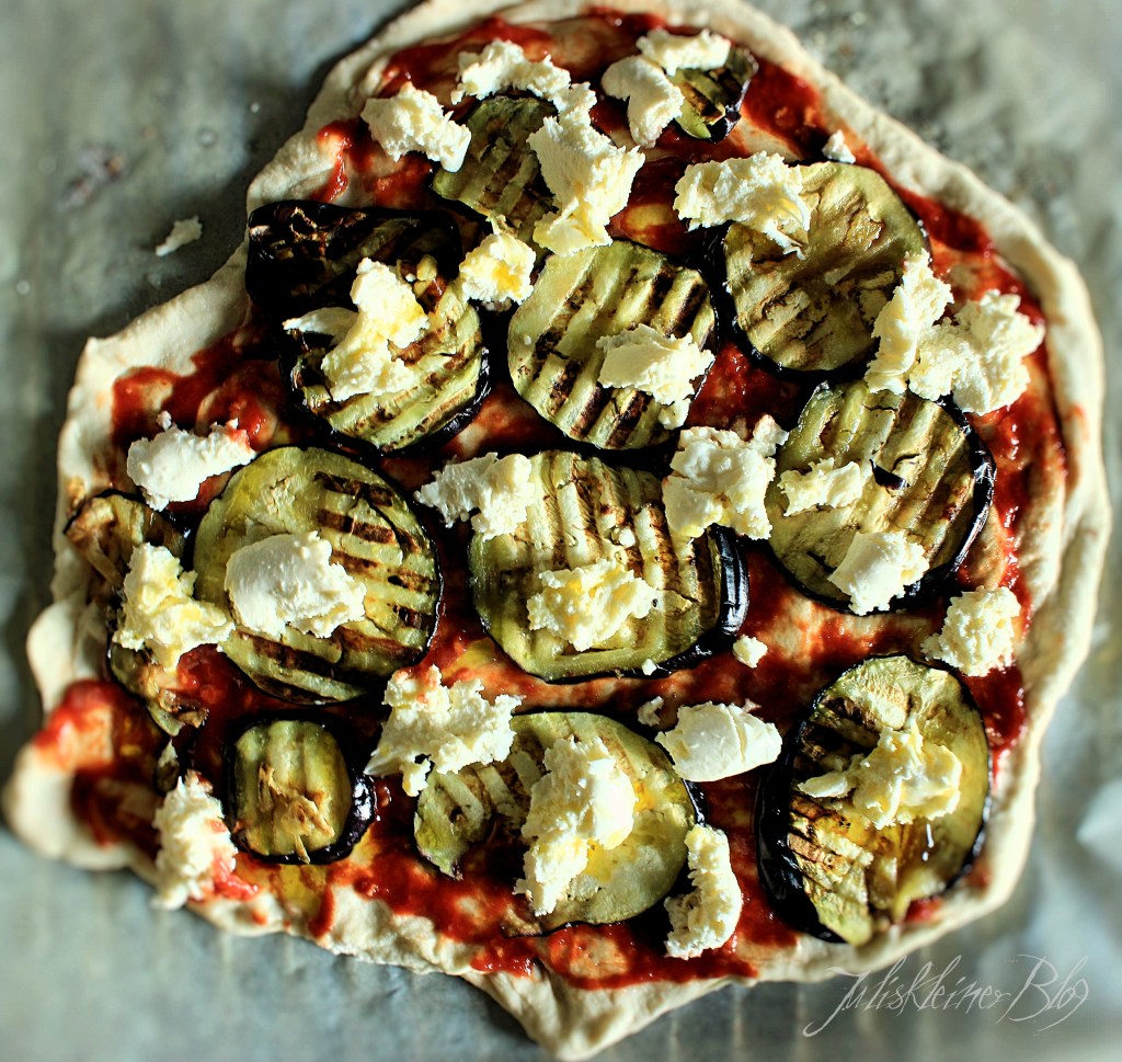 Tomatenmark mit Olivenöl, der zerdrückten Knoblauchzehe, Salz und Wasser verrühren. Den Teig dünn auseinanderziehen und mit der Tomatensauce bestreichen. Melanzani darauf verteilen.
