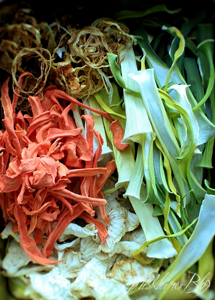Das Gemüse waschen und schälen. Dann in sehr dünn hobeln. In einem Dörrgerät nebeneinander schlichten und ca. 8 Stunden trocknen lassen, bis es komplett fest und trocken ist.
