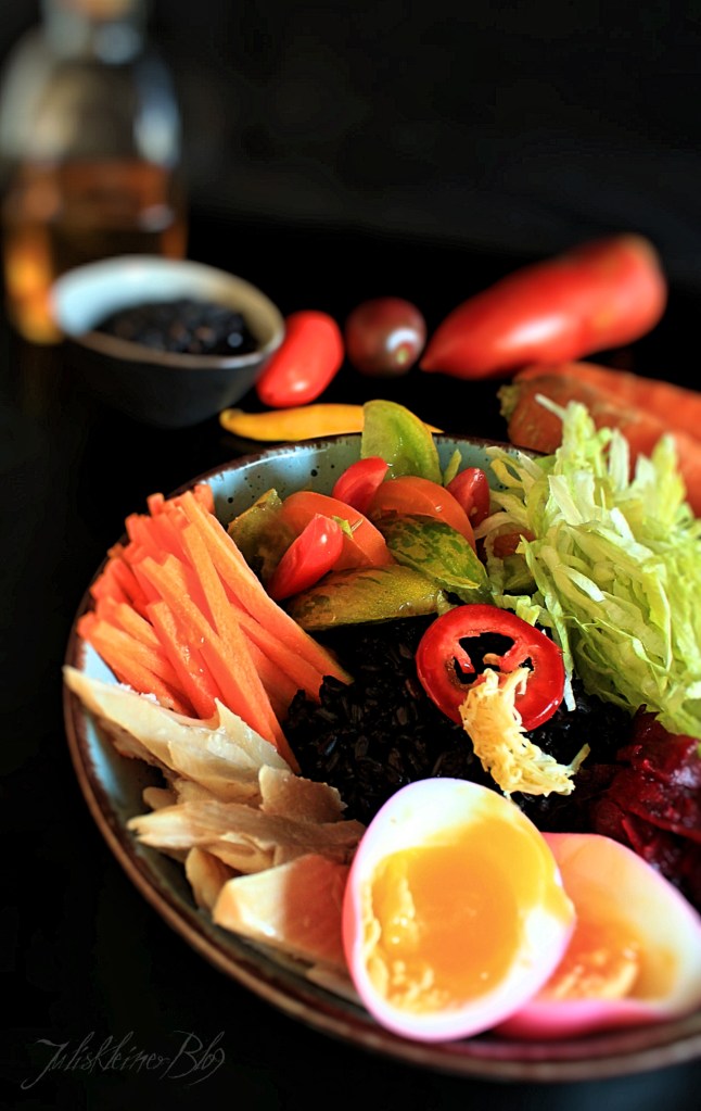 Zum Anrichten den Reis in eine Schüssel geben und die restlichen Zutaten rundherum schlichten. Das Ei einmal halbieren.