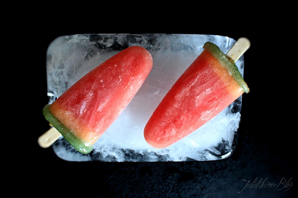Schale und Kerne von den Melonen entfernen. Zuerst die Wassermelone pürieren und damit die Formen zu 2/3 füllen. Die Eisstiele hineinstecken und für ca. 1 Stunde gefrieren lassen.