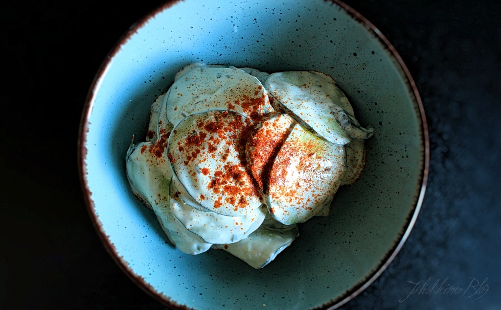 In der Zwischenzeit die Gurke waschen und in dünne Scheiben hobeln/schneiden. Die Gurke mit Sauerrahm mit Essig, Kümmel, Salz und dem klein geschnittenen Estragon vermischen.