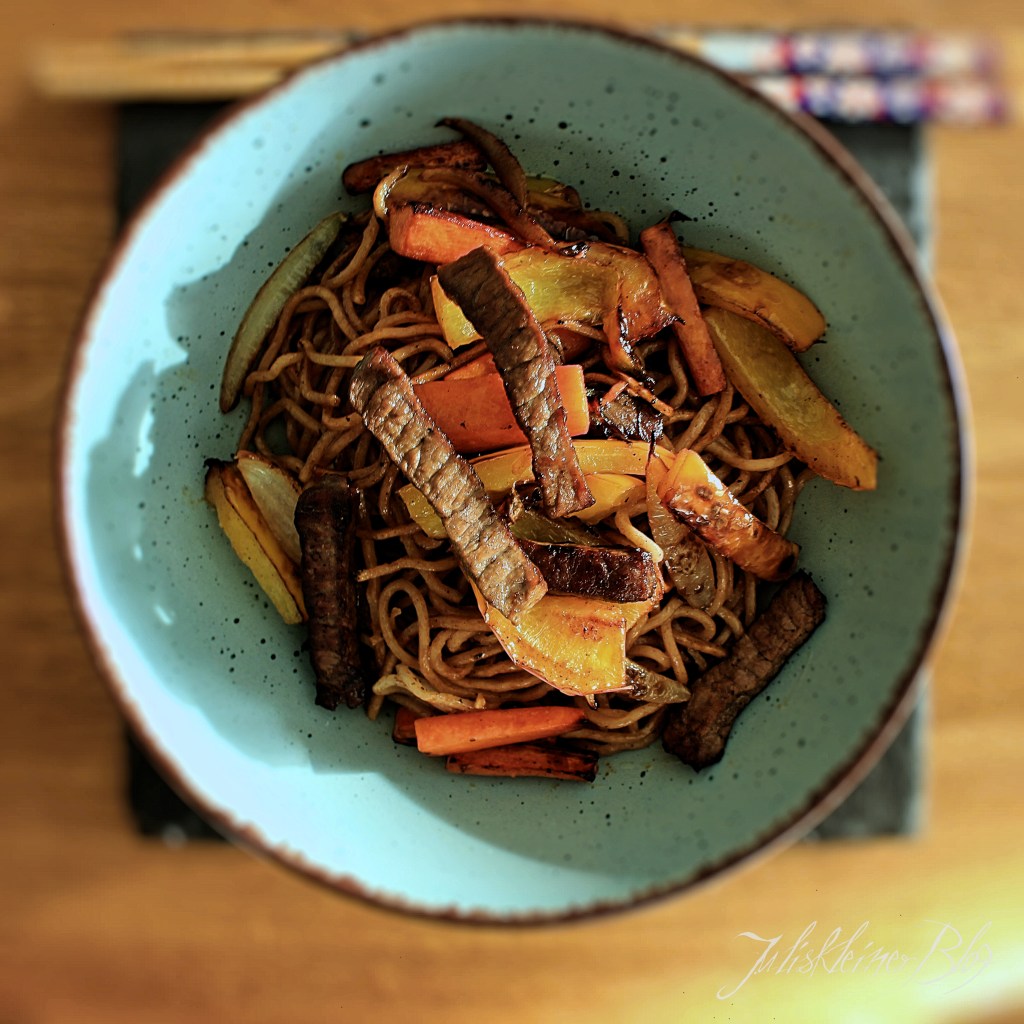 Dann das Steak in Streifen schneiden und mit den Nudeln vermischen. Anrichten.