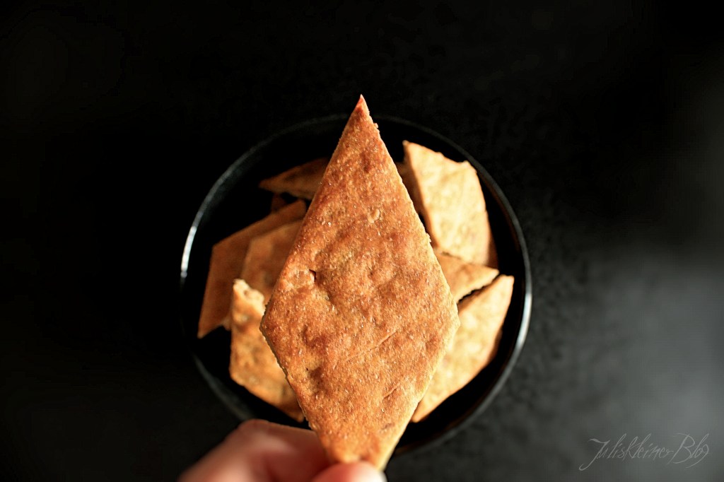 Den Teig zwischen zwei Blättern Backpapier ca. 3mm dünn ausrollen. Im Rauten Muster einschneiden, so lassen sich die Cracker nach dem Backen gut teilen.