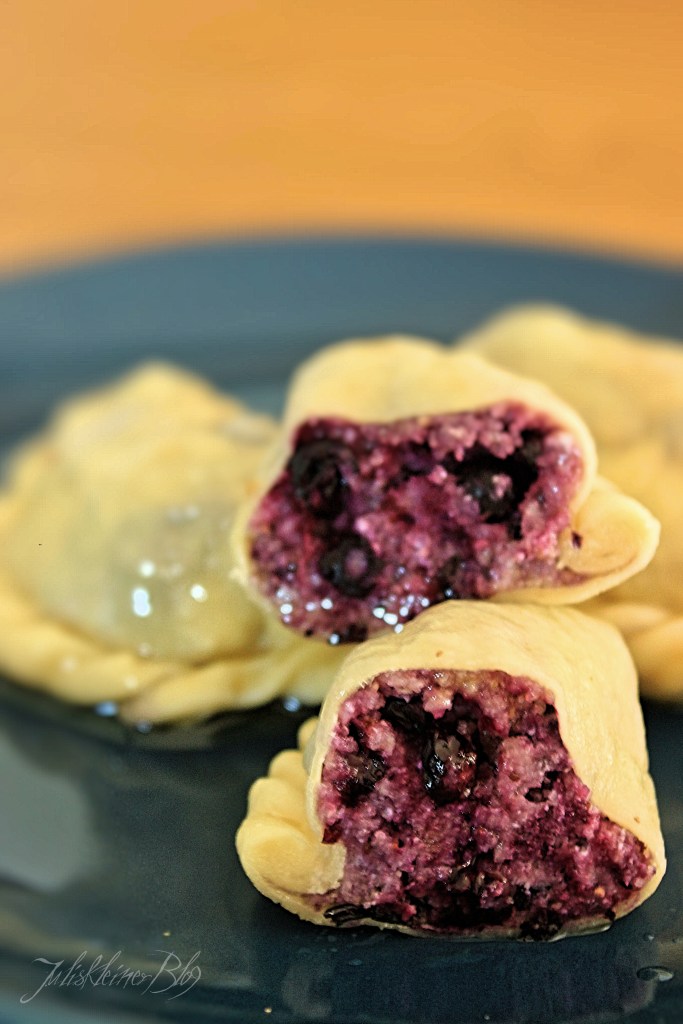 1-2 EL Fülle in die Mitte des Nudelteigs geben, den Rand der Nudel mit Wasser einstreichen und dann die Nudel zusammenklappen. Den Teig am Rand fest zusammendrücken. Dann die Nudel „grendeln“. Dazu die Nudel mit der gefalteten Seite nach unten in die Hand nehmen. Die rechte untere Ecke des Randes nehmen und in Richtung Fülle falten und festdrücken. Nicht bin in den gefüllten Teil hinein falten. Es Sollte wieder eine Ecke entstehen. Diese wieder in Richtung Fülle falten und dort festdrücken. Immer so weiter machen, bis man das Ende der Nudel erreicht hat.