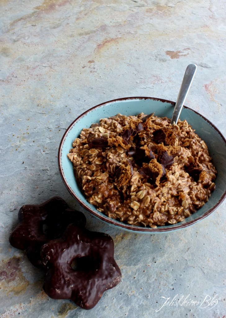 Den Lebkuchen in kleine Stücke schneiden oder brechen. Gemeinsam mit dem Christmas Spice unter das, noch warme, Porridge mischen.