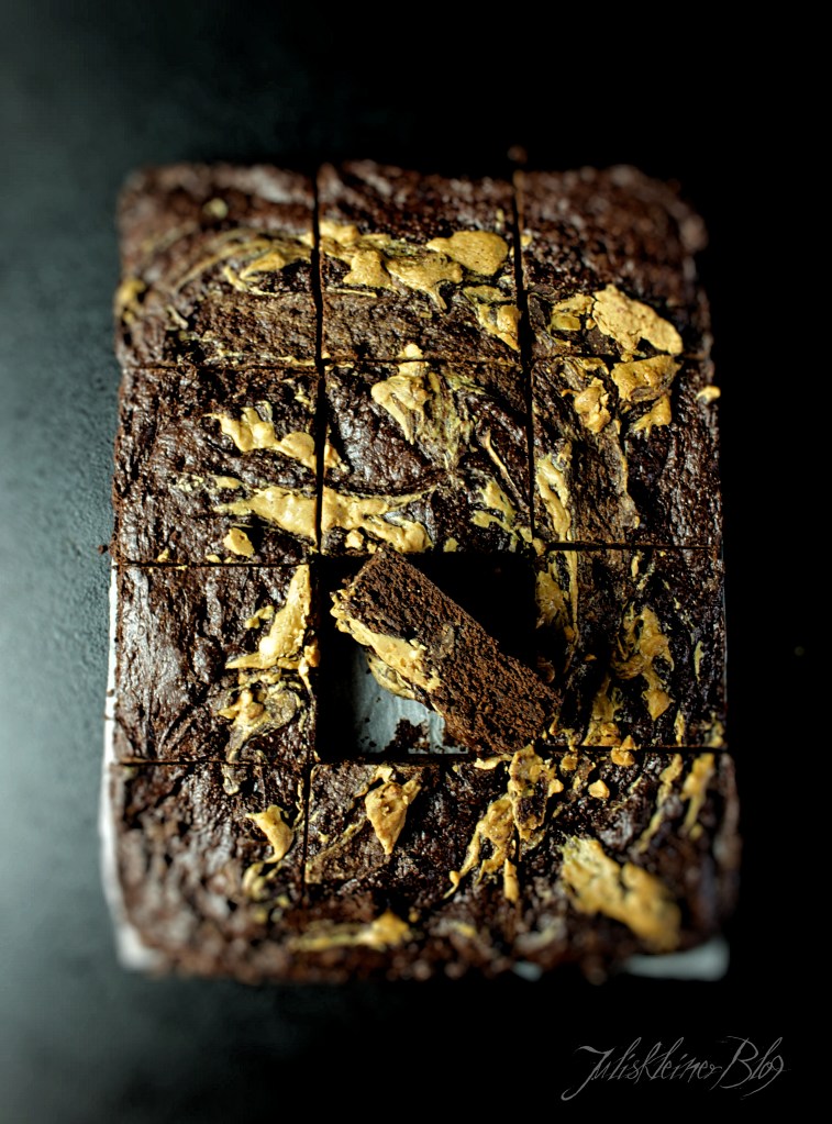 Wenn alles gut vermischt ist, die Masse ca. 1cm dick auf ein Backblech streichen. Die restlichen 40g Erdnussbutter auf dem Teig verteilen und mit einem Löffel durchziehen, damit eine Marmorierung entsteht.