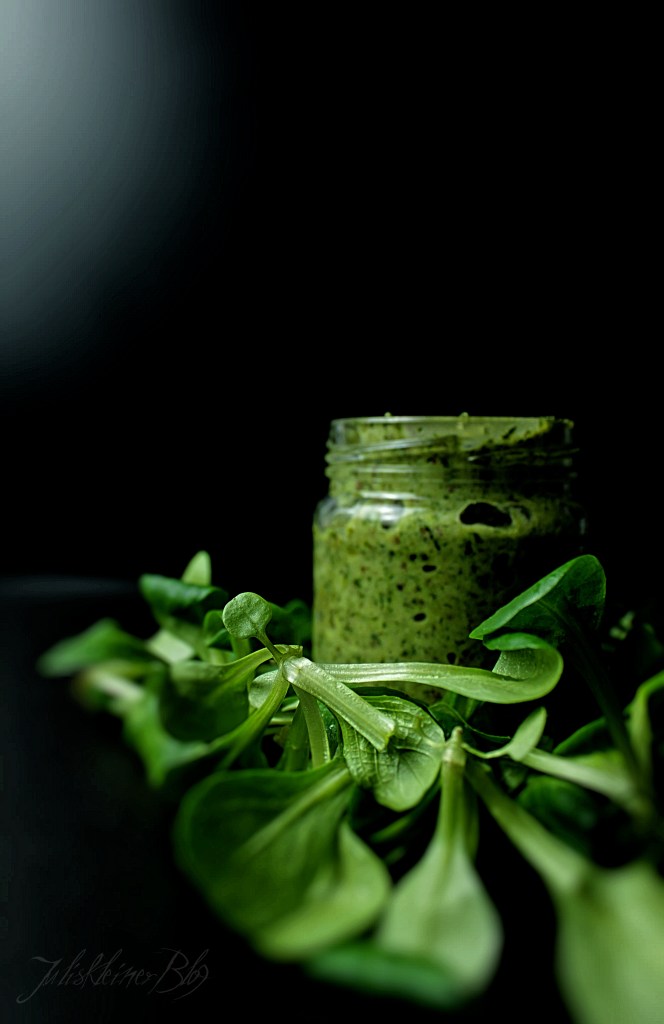 Parmesan fein reiben. Vogerlsalat waschen und abtrocknen. Zusammen mit Mandeln und Parmesan in der Küchenmaschine fein zerkleinern. Bei laufender Maschine, nach und nach, das Öl dazu gießen.