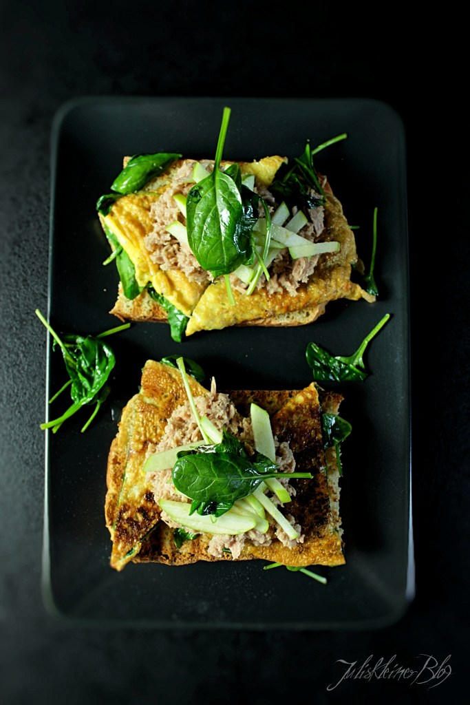 Die Eier auf dem Brot verteilen, dann Thunfisch und Apfel darauf geben.