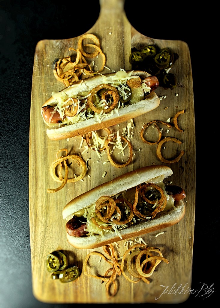 Würstchen in das Brot legen, mit Käsesauce übergießen und mit Zwiebelringen und Jalapeños bestreuen.