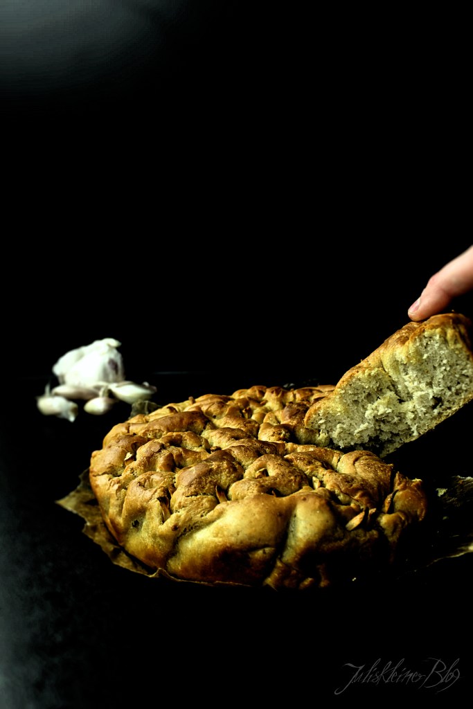 Hefe in Wasser auflösen. Mit allen anderen Zutaten, bis auf den Knoblauch, zu einem geschmeidigen Teig kneten.