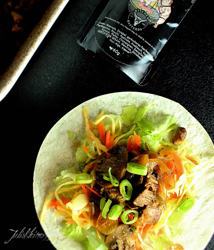Fleisch und Krautsalat im Bötchen oder Wrap servieren.