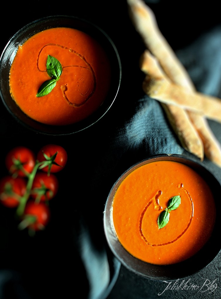 Die Basilikumblätter fein schneiden und über die Suppe streuen. Dazu passt gut Focaccia oder Pizzabrot.