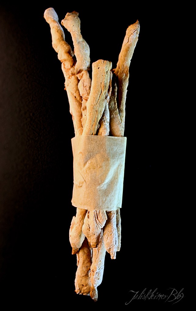 Den Teig in mehrere 1cm dicke Streifen teilen und auf ein Backblech legen. Im Ofen bei 200°C Ober- und Unterhitze für 15-20 Minuten backen.
