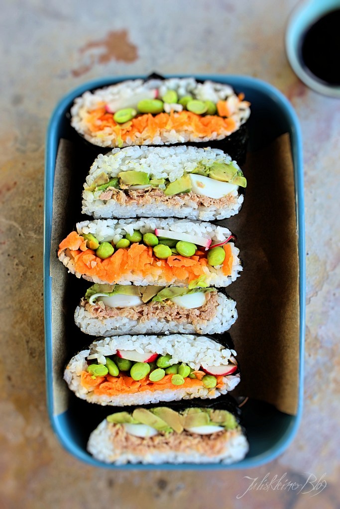 Für die Thunfisch Variante wieder Reis auf ein Nori Blatt geben. Dann etwas Thunfisch darauf verteilen, Eier darauflegen und die Avocado scheiben darauf verteilen. Wieder etwas Reis darauf geben. Dann wieder wie vorher falten.