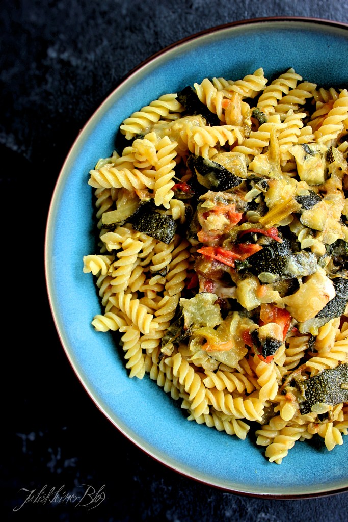 Wenn das Gemüse fertig ist, den Knoblauch aus der Schale pressen und den Stängel vom Thymian entfernen. Mascarpone unterrühren. Je nach Bedarf noch etwas vom Nudelwasser dazu geben.