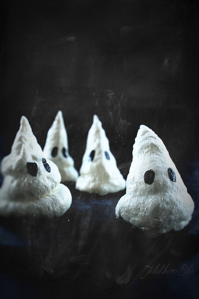 Die Geister für ca. 10 Minuten backen, dann die Hitze auf 80°C Umluft reduzieren und für weitere 50 Minuten trocknen lassen. Das Baiser ist nach der Backzeit außen knusprig, hat aber noch einen weichen Kern.