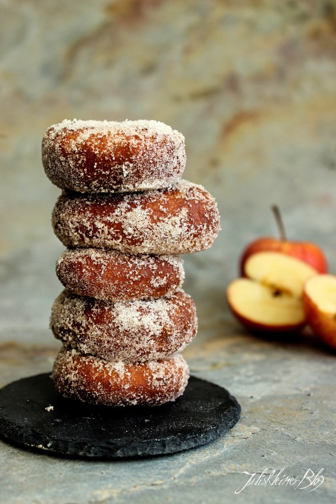 Zucker mit Zimt und Muskatnuss vermischen und die hälfte der Donuts darin wälzen. Die andere Hälfte mit dem übrigen Apfelsirup bestreichen.