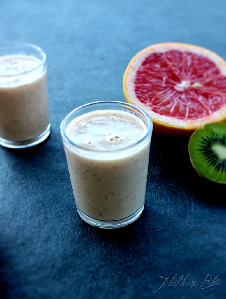 Ingwer schälen und fein reiben. Grapefruit, Banane und Kiwi schälen und in grobe Stücke scheiden.