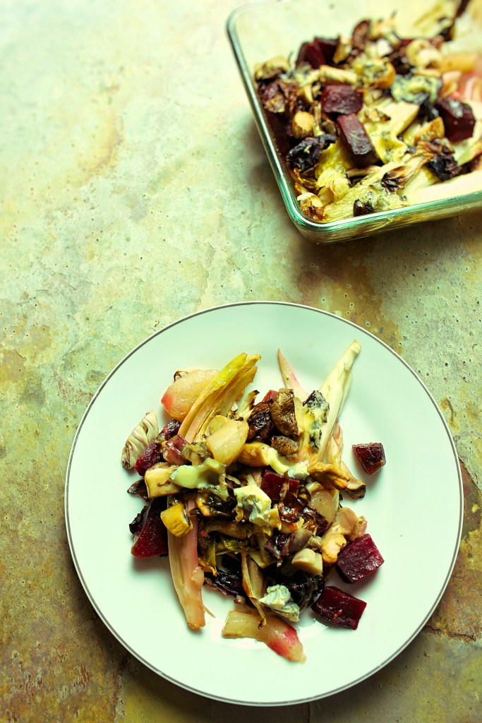 Alles in grobe Stücke schneiden und in eine ofenfeste Form geben. Olivenöl darüber träufeln, mit Salz und Pfeffer würzen und alles gut durchmischen. Blauschimmelkäse darüber streuen und für ca. 25 Minuten im Ofen garen.